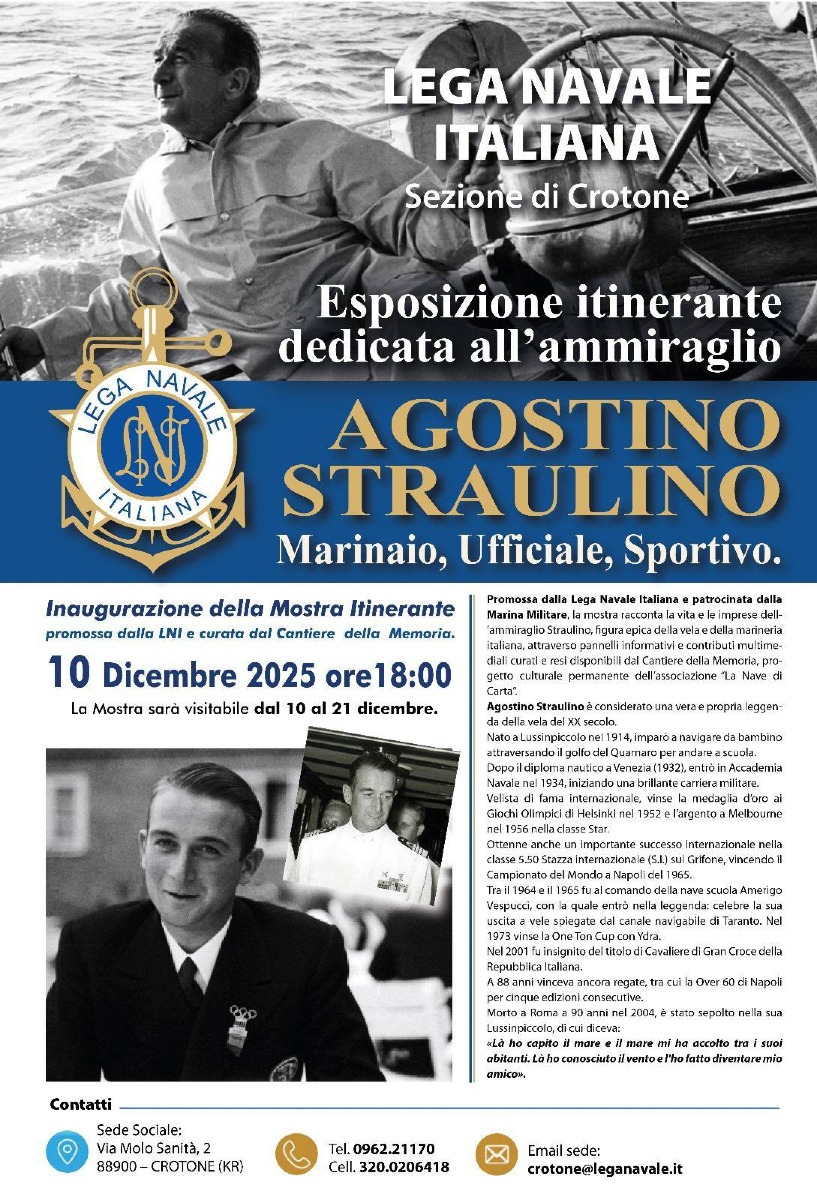 Crotone - Nella giornata del 10 dicembre 2025 presso la Lega Navale di Crotone si svolgerà la cerimonia di inaugurazione della mostra dedicata al marinaio, ufficiale e sportivo Agostino Straulino.