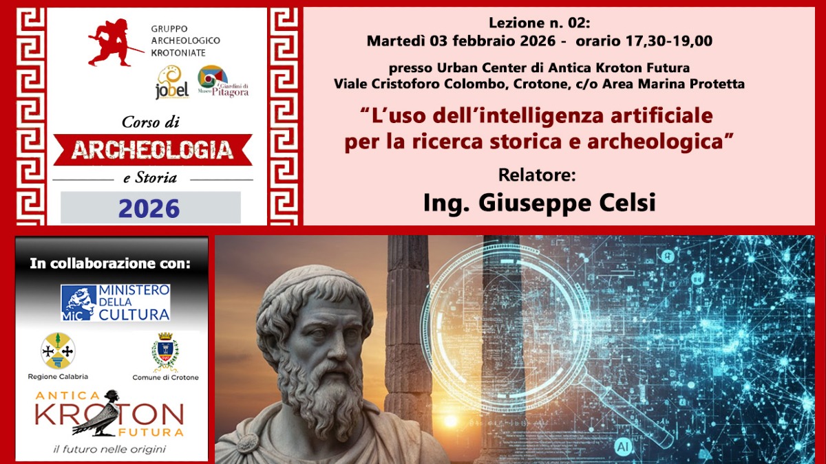 Crotone - Prosegue il percorso formativo del Gruppo Archeologico Krotoniate (GAK) dedicato all’archeologia e alla storia, con un appuntamento che guarda al futuro delle discipline umanistiche. Venerdì 3 febbraio 2026, dalle 17:30 alle 19:00, l’Urban Center di Antica Kroton Futura, in Viale Cristoforo Colombo a Crotone, ospiterà la seconda lezione del ciclo, affidata all’ingegnere Giuseppe Celsi e incentrata su un tema di crescente attualità: “L’uso dell’intelligenza artificiale per la ricerca storica e archeologica”.