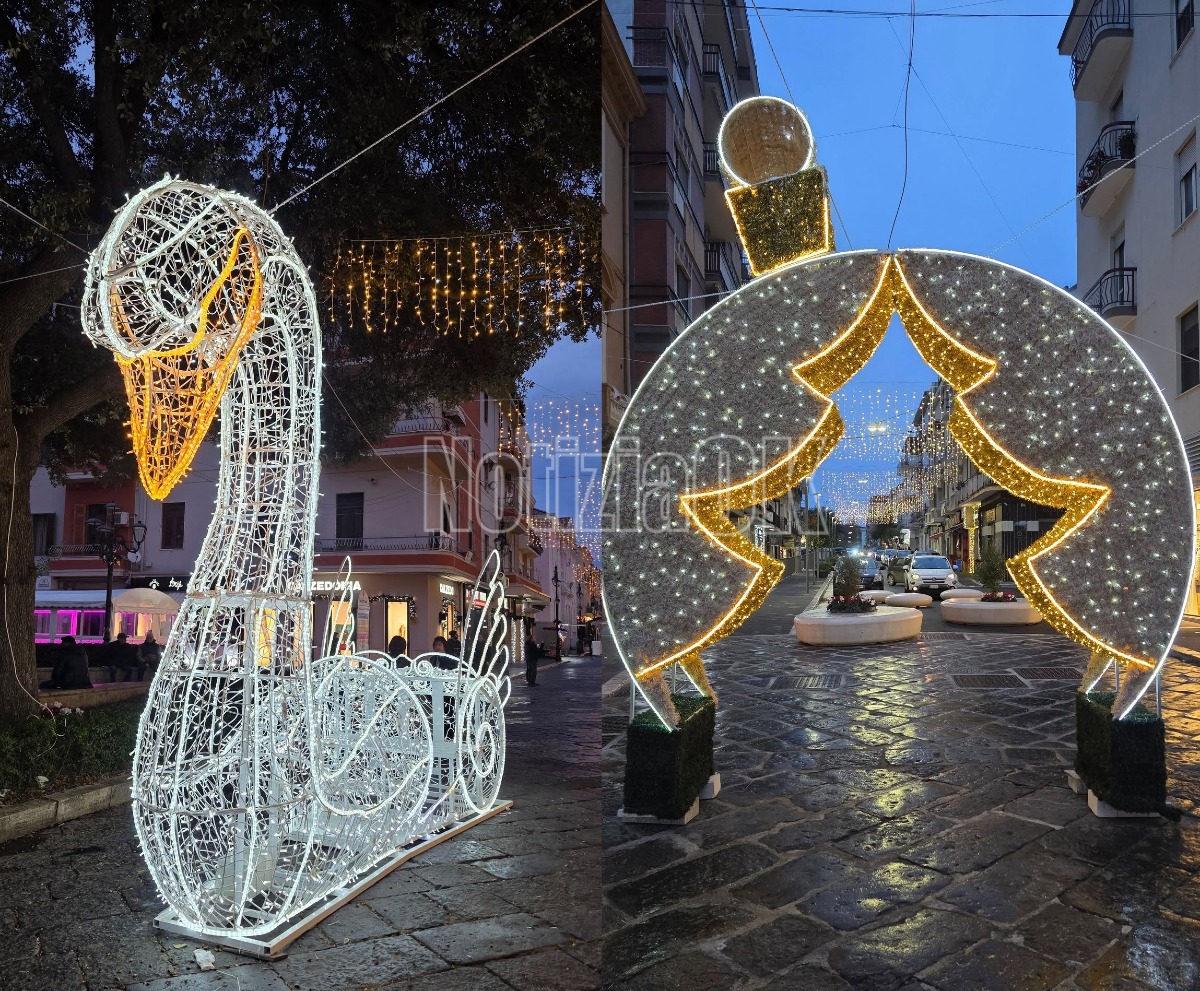 Crotone - Due nuove decorazioni natalizie illuminano corso Vittorio Veneto, nei pressi del palazzo dell’ente comunale, contribuendo a rendere ancora più suggestivo il centro cittadino. Oltre alle luci già presenti, sono state infatti installate due strutture luminose pensate per regalare un’atmosfera più calda e coinvolgente al Natale dei crotonesi.