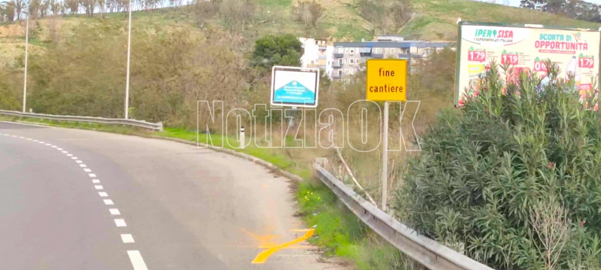 Oltre ai cartelli di inizio e fine cantiere le strisce stradali sono state tinte di giallo.