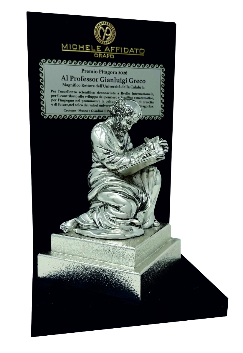 Cuore simbolico del premio è il “Pitagora d’Argento”, una prestigiosa scultura realizzata dai maestri orafi Michele e Antonio Affidato, eccellenze riconosciute dell’arte orafa italiana. L’opera trae ispirazione dal celebre dipinto “La Scuola di Atene” di Raffaello Sanzio, capolavoro assoluto del Rinascimento e sintesi visiva del pensiero filosofico occidentale.