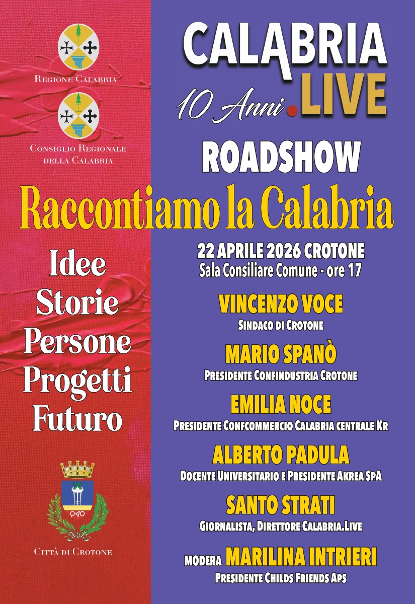 CROTONE – Il prossimo 22 aprile alle ore 17, nella Sala Consiliare del Comune di Crotone, si terrà l’iniziativa “Raccontiamo la Calabria”, tappa crotonese del roadshow promosso per celebrare i 10 anni di Calabria Live – quotidiano.