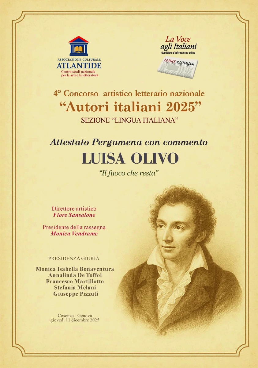 L'Olivo ha ricevuto un Attestato Pergamena con commento per la sua poesia “Il fuoco che resta”, una riflessione profonda e intensa sulla permanenza della parola poetica, un tema che rispecchia pienamente il cuore della sua scrittura. Con emozione, la poetessa ha voluto esprimere il suo grazie al Direttore Fiore Sansalone, alla Presidente Monica Vendrame e alla prestigiosa Giuria, sottolineando l’attenzione e la sensibilità con cui valorizzano la parola poetica.