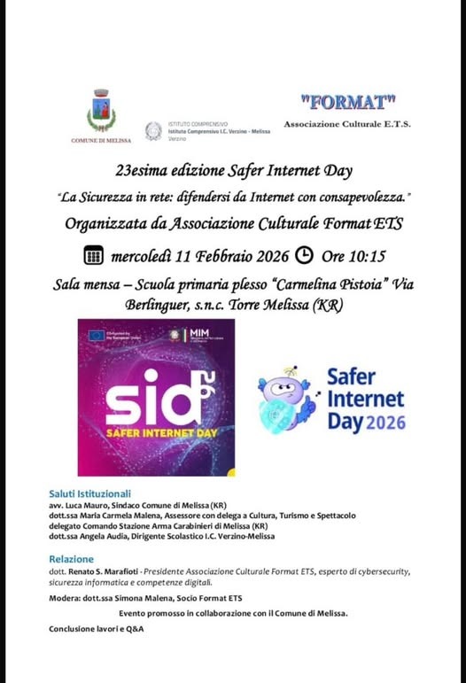 Melissa - Il Comune di Melissa, in collaborazione con FORMAT ETS e l’Istituto Comprensivo Verzino–Melissa, organizza l’incontro “La sicurezza in rete: difendersi da Internet con consapevolezza”. L’evento si terrà il 11 febbraio 2026 alle ore 10:15, presso la Scuola primaria "Carmelina Pistoia" di Torre Melissa (KR).