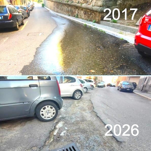 Oggi, nel 2026, quella stessa striscia di cemento è ancora lì, immutata, mentre del bitume promesso non c’è traccia. Una situazione che continua a creare disagi e che alimenta il malcontento dei cittadini, i quali chiedono un intervento risolutivo dopo anni di sollecitazioni rimaste senza risposta.