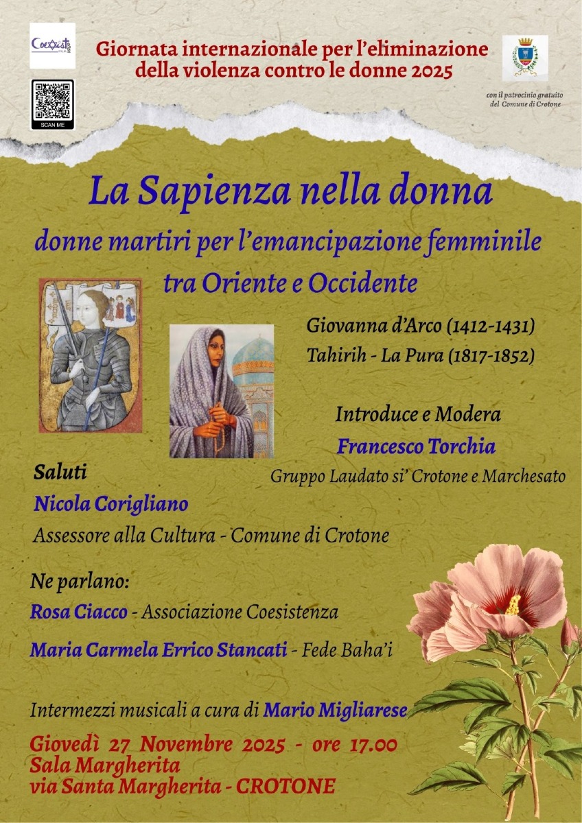 La Sala Margherita di Crotone ospiterà, il 27 novembre alle ore 17, un reading dedicato al tema dell’emancipazione femminile, inserito nel solco delle iniziative promosse in occasione della Giornata internazionale per l’eliminazione della violenza sulle donne. L’incontro, organizzato dall’associazione Coesistenza, proporrà un percorso narrativo attraverso due figure femminili simboliche: Giovanna d’Arco e Thairih-La Pura, interpretate dai lettori partecipanti. A impreziosire l’evento saranno gli intermezzi musicali a cura del cantautore Mario Migliarese.
