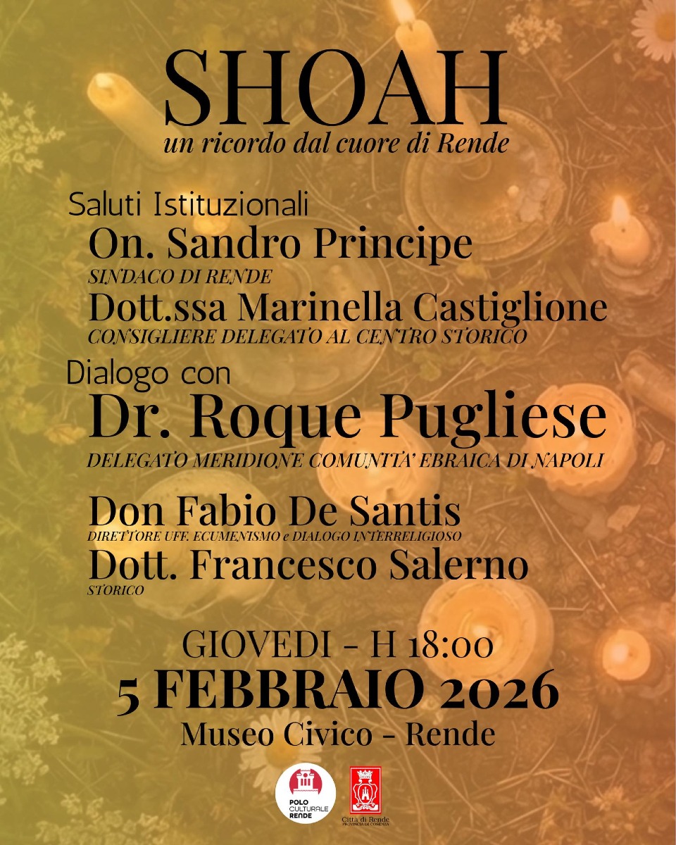 Rende - Il Comune di Rende annuncia una nuova iniziativa dedicata alla memoria e alla riflessione sui grandi snodi culturali e storici che aiutano a comprendere il presente. L’incontro, intitolato “Shoah – Il ricordo dal cuore di Rende”, si terrà giovedì 5 febbraio 2026 alle ore 18:00.