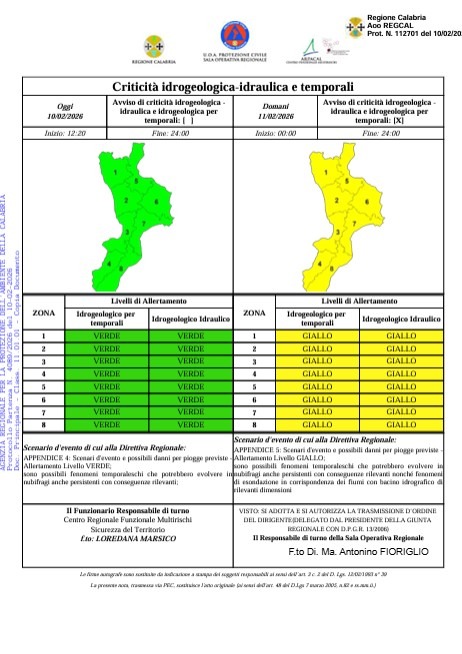 Nel dettaglio, dalle ore 00:00 alle ore 24:00 di domani, mercoledì 11 febbraio 2026, è stato diramato sul territorio un avviso di criticità idrogeologica e idraulica per temporali