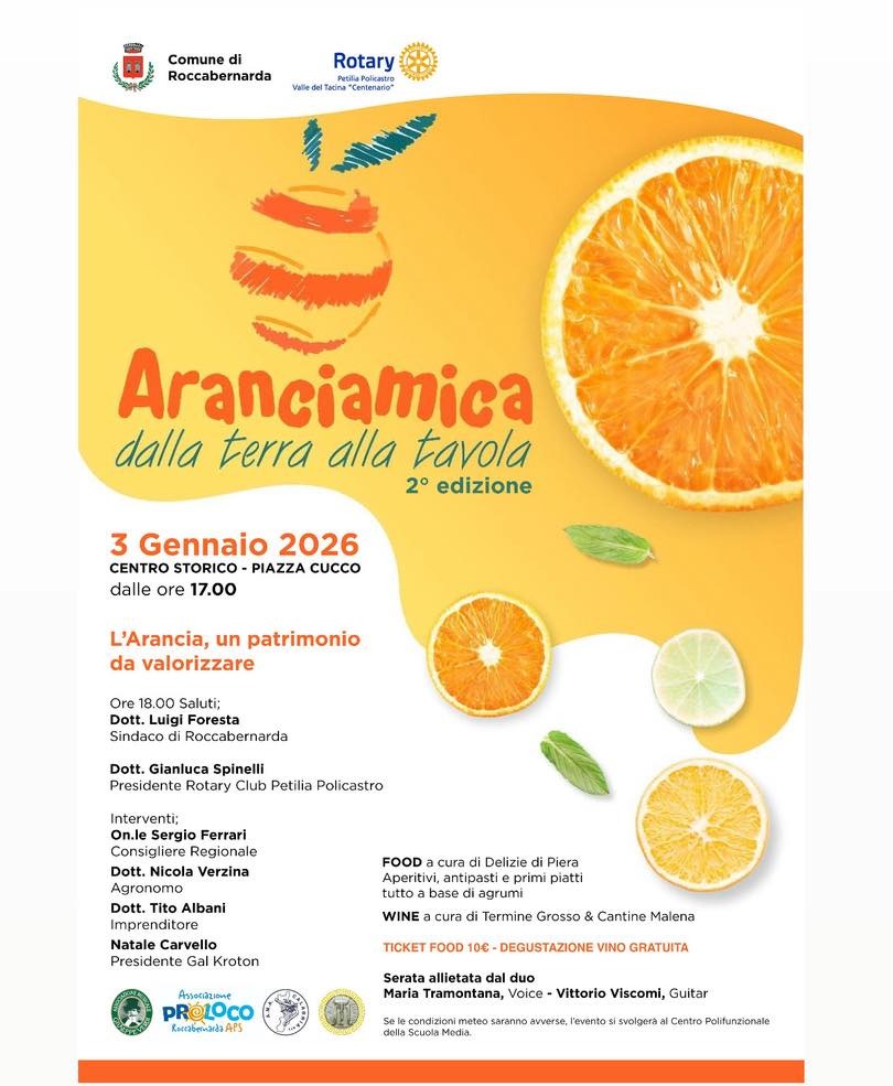 Roccabernarda è pronta ad accogliere, il 3 gennaio 2026, la II edizione di “Arancia Amica – Dalla Terra alla Tavola”, un evento che nasce dal cuore pulsante del nostro territorio e guarda al futuro con orgoglio e consapevolezza. Promossa dall’Amministrazione Comunale in collaborazione con il Rotary Club di Petilia Policastro, Distretto 2102 – Valle del Tacina, l'iniziativa ha come obiettivo quello di valorizzare Roccabernarda e il suo ruolo di paese produttore di arance, ma soprattutto di raccontare la storia di un territorio che, attraverso il lavoro, le tradizioni e l’identità, ha costruito la sua unicità. In Calabria, l’arancia non è solo un frutto, ma il frutto di una terra generosa, un clima ineguagliabile e mani esperte che da generazioni coltivano e rispettano la natura.