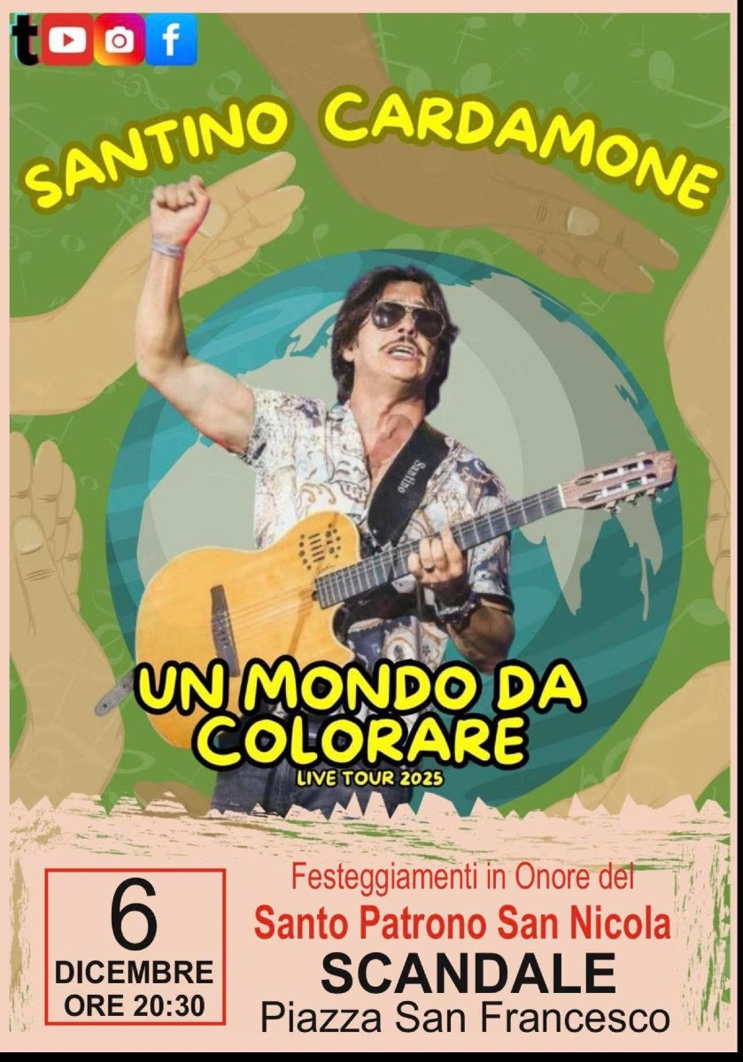 Scandale - Un evento per gli amanti della musica e della tradizione: Santino Cardamone sarà in concerto a Scandale il prossimo 6 dicembre alle ore 20:30 per il suo "Un Mondo da Colorare Live Tour 2025".